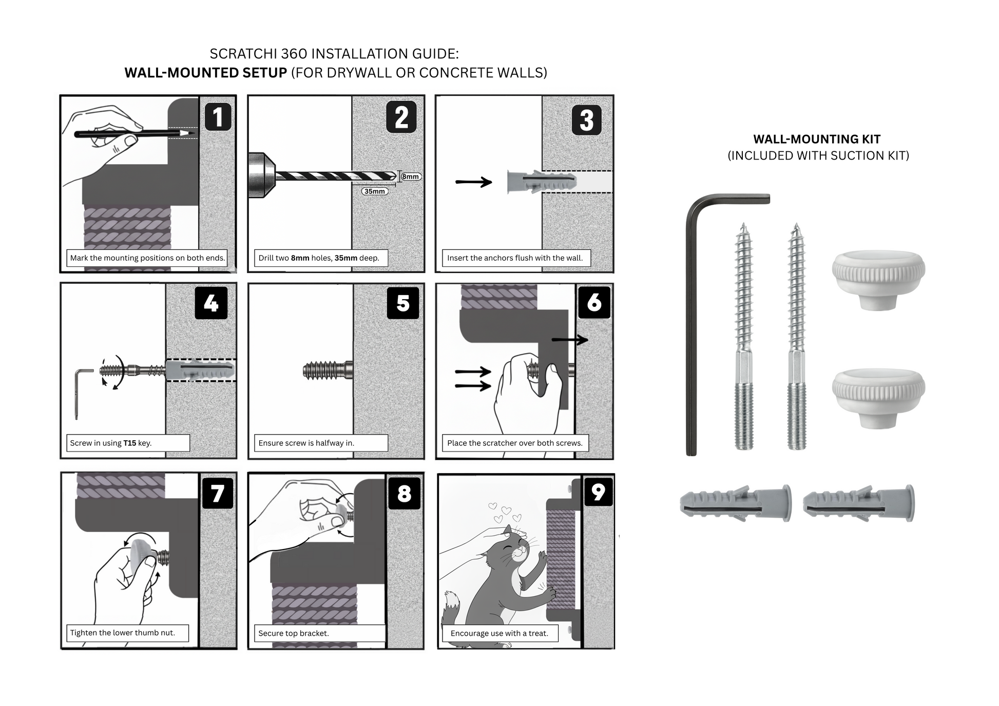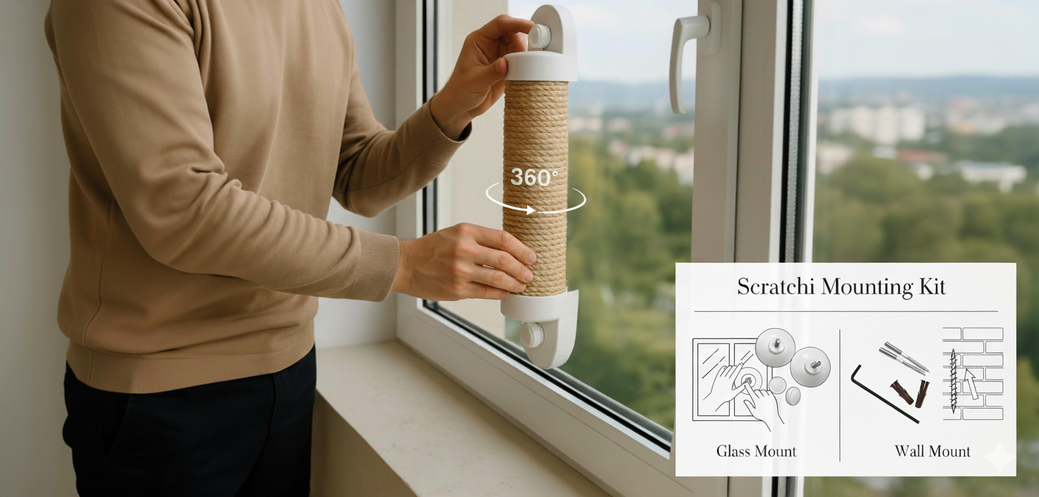 The punch-free suction cup design allows for quick and secure installation on glass, tile, or smooth walls - no drilling or tools needed. Lightweight, durable, and easy to refill, the SCRATCHI 360° is ideal for cats of all sizes who love to scratch vertically or horizontally.